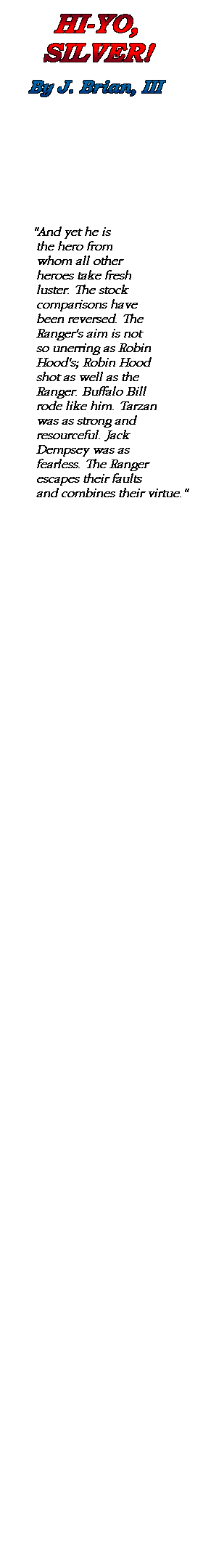 And yet he is the hero from whom all other heroes take fresh luster. The stock comparisons have been reversed. The Ranger's aim is not so unerring as Robin Hood's; Robin Hood shot as well as the Ranger. Buffalo Bill rode like him. Tarzan was as strong and resourceful. Jack Dempsey was as fearless. The Ranger escapes their faults and combines their virtue.